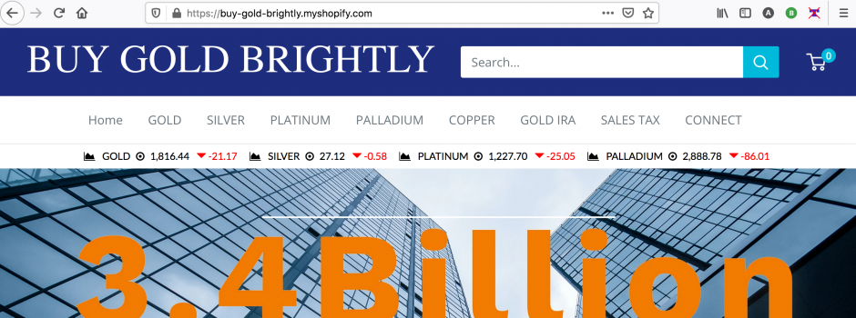 Until recently, Buy Gold Brightly had two divisions: A site that referred visitors to gold dealers nationwide –which was taken down in the weeks following my interview with Rottkov– and a Myshopify site that allows consumers to purchase coins and invest in gold IRA plans.